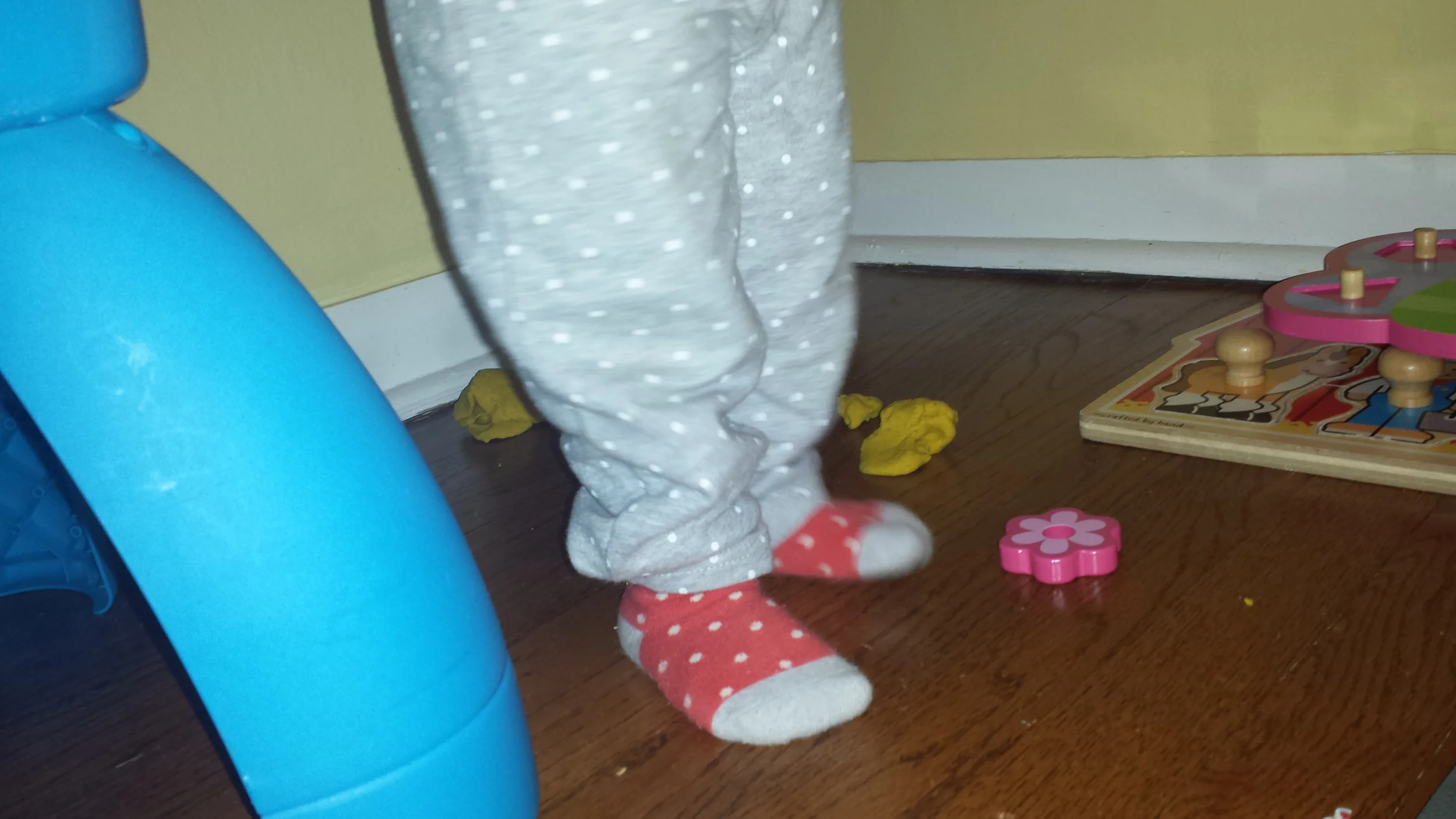 I enter her room and jovially announce that I have been making something EXTRA special for her while she was sleeping! Her eyes widen and her mind races (I can only assume) with the possibilities. I bring her into her playroom and proudly present the finished product. "It's PLAYDOUGH!!!!" I proclaim. Because she is a toddler and does not have a fully functioning prefrontal cortex, she does not mask her look of disappointment. I am sure she just doesn't realize how much fun she is missing, so I dig in myself, making balls and snakes and patting and smashing, all with great delight. She humors me for about a minute, pulling small chunks out of the jar with her fingers and dropping them on the floor.