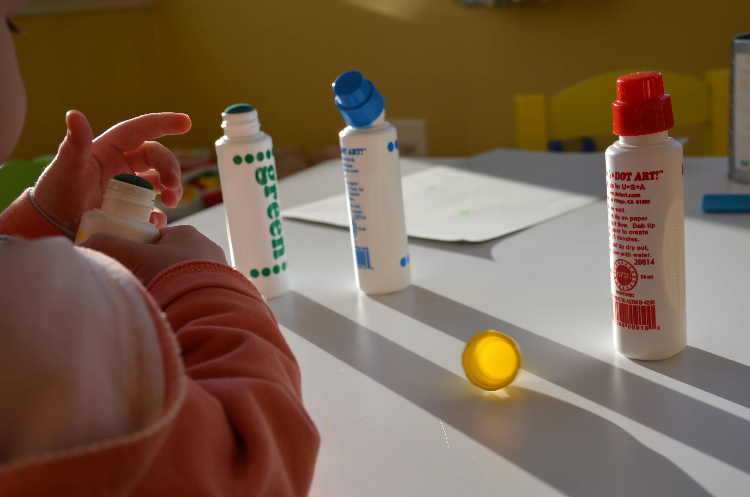 I felt simultaneous pride and guilt. Pride for my daughter's ingenuity and careful use of materials, guilt that every other time we had used the dot paint, I had held tightly to the caps, quickly replacing them for the sake of neatness and organization.